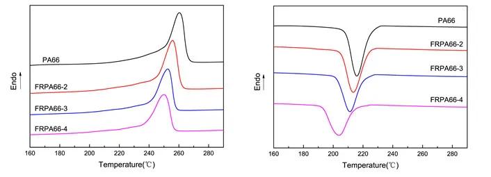 由上表可知,從PA66到FRPA66–4,相對黏度及分子量降低主要是由于DDP的剛性結構位阻效應較大,阻礙PA66聚合,使聚合反應變得困難,黏度下降,聚合度降低。
