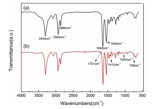 從圖中b曲線可觀察到,FRPA66-4特征峰與PA66(圖中a曲線)基本一致,說明己二酸己二胺鹽已合成PA66。同時還發現FRPA66-4出現一些新吸收峰,1701 cm-1處為C=O特征吸收峰,1415 cm-1處為P-C特征吸收峰,1042 cm-1處為P=O特征吸收峰,759 cm-1處為苯環C-H特征吸收峰。分析可知,DDP經共聚反應引入PA66分子鏈。