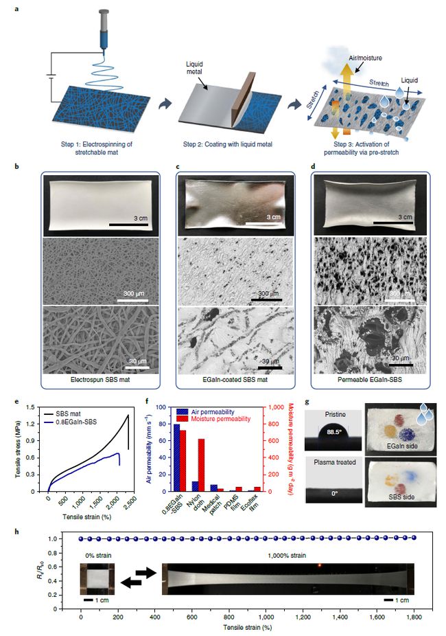 液態(tài)金屬纖維氈的制備主要有三個步驟:(1)超彈性纖維氈(poly(styrene-block-butadiene-block-styrene),SBS)的靜電紡絲;(2)在可拉伸氈上涂覆液態(tài)金屬EGaIn;(3)通過預拉伸激活滲透性。剛涂覆液態(tài)金屬EGaIn的彈性纖維氈SBS表現出類似金屬的光澤,幾乎不具有滲透性,將基底拉伸至1800%應變,反復循環(huán)12次后,基底顏色變暗,EGaIn轉變?yōu)閼覓煸赟BS微纖維之間的網狀多孔結構,EGaIn-SBS的透氣性超過了商業(yè)化的尼龍布和醫(yī)用貼片,初始電導率約10000 S m-1, 即使處于1800%的拉伸應變下,電阻變化也僅為4.1%。
