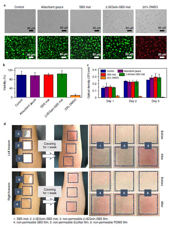 進一步的,作者使用L-929細胞作為模型細胞,探究了EGaIn-SBS的生物相容性。定量分析顯示,測試組的細胞活力在24小時之后仍保持在95%左右,沒有明顯證據表明EGaIn-具有毒性。在兔子和人類皮膚上的進一步測試表明,EGaIn-SBS的透氣性良好,即使佩戴一周也不會對皮膚造成任何負面影響(紅腫等)。