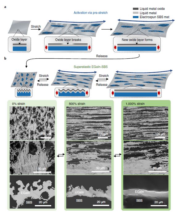 近日,香港理工大學鄭子劍課題組報道了一種可拉伸導體——“液態(tài)金屬纖維氈”(liquid-metal fibre mat,LMFM),該導體通過將液態(tài)金屬簡單涂覆或印刷到靜電紡彈性纖維氈上而制成。懸掛在彈性纖維之間的液態(tài)金屬會自組織成橫向網狀和垂直彎曲的結構,同時提供高滲透性,可拉伸性,電導率和電穩(wěn)定性。此外,液態(tài)金屬纖維氈具有良好的生物相容性,對超過1800%應變的全向拉伸具有很好的適應性。