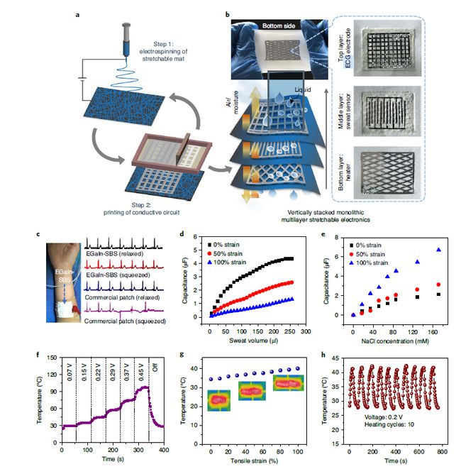 EGaIn-SBS的增材制造原理和自適應超彈性為通過印刷制造可拉伸電子產品提供了極好的平臺。基于該工藝的LED陣列能夠承受500%的應變和720°的扭曲,并能夠在水下工作。即使對其進行120分鐘的清洗,也不會影響LED陣列的性能。通過重復的靜電紡絲和印刷工藝,還可以制造垂直堆疊的多層電路,提供具有出色的佩戴舒適性和多功能性的新型的整體可拉伸電子產品。作者制備了三層印刷電路的可拉伸電子氈,分別用作生理信號傳感(頂層)、汗液傳感(中間層)和加熱(底層),實現了對人體生理狀態(tài)和電熱療法的多通道監(jiān)測。包括拉伸、壓縮狀態(tài)下對生理信號的監(jiān)測,汗液中溶質濃度的監(jiān)測以及表面溫度的調節(jié)等(30-90℃)。