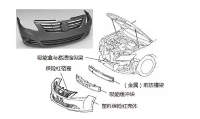 通常所說的塑料汽車保險杠,其實只是真正意義上的保險杠的一部分。以汽車前保險杠為例,真正的汽車保險杠主要由塑料殼體(也稱保險杠蒙皮,前保險杠上面通常嵌裝有格柵)、吸能緩沖塊(主要為泡沫)和防撞梁(也稱橫梁)等三部分組成。